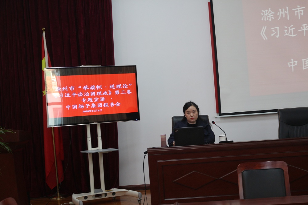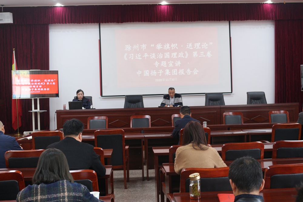 為學(xué)懂弄通做實(shí)習(xí)近平新時(shí)代中國(guó)特色社會(huì)主義思想,深入學(xué)習(xí)宣傳貫徹習(xí)近平總書(shū)記考察安徽重要講話精神和黨的十九屆五中全會(huì)精神,推動(dòng)黨的最新理論成果在國(guó)有企業(yè)落地生根,開(kāi)花結(jié)果, 11月6日下午,滁州市“舉旗幟·送理論”《習(xí)近平談治國(guó)理政》第三卷專題宣講中國(guó)揚(yáng)子集團(tuán)報(bào)告會(huì)在揚(yáng)子集團(tuán)舉辦,揚(yáng)子集團(tuán)黨委班子成員、黨員干部和全體職工參加活動(dòng)。